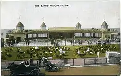 In 1923–1924 he designed the first phase of this bandstand as one of the earliest reinforced concrete structures of its kind in the UK.[1][2][44][45] It was supported above the tidal beach on concrete pillars sheathed in cast iron, so that it was level with the promenade.[46] Its cantilevered roof supported seaward-facing balconies with space for deckchairs, and sheltered both a lower deck and the stage. Metal, glazed screens at the east and west sides of the building crossed the promenade, and could be moved to protect the audience from wind, or retracted into the wings to allow promenaders to cross when no band was playing.[1][46] The seating area in front of the stage was a railed-off section of the promenade, and the seating on the roof above the stage included two copper-covered domes, plus two domes which doubled as refreshment kiosks.[46] In the 1920s and 1930s the conductor of a visiting military band was considered a VIP, therefore a red carpet would be laid across the road so that he could make his grand entrance from the Connaught Hotel opposite the Bandstand.[47]