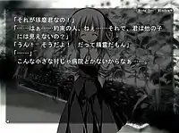 There are three parts in the gameplay. The first part, entitled the "Past Chapter" (過去編, Kako Hen) serves to set up the story and for the protagonist to meet and get to know the characters, especially the three heroines. Following the first part, there is a time where the protagonist must leave for several years only to come back in the so-called "Reunion Chapter" (再会編, Saikai Hen) and meet the girls he knew before who have changed somewhat. After the player chooses one of the girls, the third part in the story called the "After Game" (アトゲー, Ato Gee) concludes the game, which is also where the majority of the erotic content is viewable. The story consists primarily of the first two parts, which are a flashback from the protagonist's point of view. Within this flashback are around fifty smaller flashbacks from the past of the protagonist and the girls'. While the game is intended to be a serious drama, the gameplay is peppered with unrelated bouts of humor, which come with computer graphic artwork of the characters in a humorous situation depicted in a super deformed style.[1] The pacing of the game is rather slow and tends to reuse the same flashback scenes. Additionally, certain flashbacks are viewable no matter which girls' scenario is pursued and these cannot be skipped.