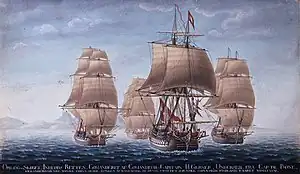 ![]() Indfødsretten flanked by the frigates Kongens af Danmark and Disklo and with the Swedish frigate Finland in the background, 1781. | |