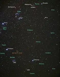 HE 0437-5439 is a massive, unbound hypervelocity star (HVS), also called HVS3.[2] It is a main sequence B-type star located in the Dorado constellation. It was discovered in 2005 with the Kueyen 8.2-metre (320 in) telescope, which is part of the European Southern Observatory's Very Large Telescope array. HE 0437-5439 is a young star, with an age of around 30 million years.[3] The mass of the star is almost nine times greater than the mass of the Sun[4] and the star is located 200,000 light years away in the direction of the Dorado constellation, 16 degrees northwest of the Large Magellanic Cloud (LMC) and farther away than the LMC.[3] The star appears to be receding at an extremely high velocity of 723 kilometres per second (449 mi/s), or 2,600,000 kilometres per hour (1,600,000 mph). At this speed, the star is no longer gravitationally bound and will leave the Milky Way galaxy system and escape into intergalactic space. It was thought to have originated in the LMC and been ejected from it soon after birth. This could happen if it originally was one of a pair of stars and if there is a supermassive black hole in the LMC.[4]
