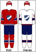 HIFK uses a shield for their logo, with a four pointed star and text I.F.K. and year of formation 1897 on it. They wear red, white and blue colored jerseys, and have worn those colors since their beginnings. For the 1993-94 season, HIFK changed their logo to a five pointed star with text saying HIFK Hockey on it. Unpopular with fans, and HIFK wanting to modernize their brand, changed their logo again in 1996 to a red big cat on a blue circle. Commonly referred to as "petologo" (English: "beast logo") among fans. When the beast logo became HIFK's primary logo for the 1996-97 season, they reintroduced the original shield logo to become their jersey's new shoulder patches. For the 2008-09 season, HIFK made their original shield logo the primary logo once again. It would swap places with the beast logo on the jerseys, making the beast logo their new shoulder patches until 2017, when the beast logo was eliminated from the jerseys entirely.