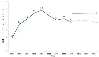 [1]HIV/AIDS in Nigeria was a concern in the 2000s, when an estimated seven million people had HIV/AIDS. In 2008, the HIV prevalence rate among adults aged between 15 and 49 was 3.9 percent, in 2018 the rate among adults aged between 15 and 65 was 1.5 percent.[2] As elsewhere in Africa, women are statistically more likely to have HIV/AIDS. The Nigeria HIV/AIDS Indicator and Impact Survey (NAIIS) was the world's largest and presented statistics which showed the overall numbers were lower than expected. Antiretroviral treatment is available, but people prefer to take the therapy secretly, since there is still noticeable discrimination against people with HIV/AIDS.[3][4]