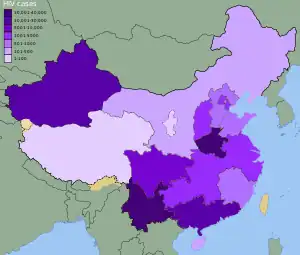 Yunnan province has shown strong support for implementation and advocacy of harm-reduction strategies that reduce HIV transmission in its many drug users, whereas Henan province had been slower to respond to the needs of former plasma donors in the early stages of the epidemic.[22] The distribution of HIV in China is not even, and is concentrated in areas with high drug use (i.e. Yunnan, Guangxi, Xinjiang, and Sichuan) and in areas where people were infected through unsafe blood or plasma donation (i.e. Henan, Anhui, Hebei, Shanxi, and Hubei). The number of cases ranges dramatically between provinces (see the map of China on your right), with, for example, just 20 cases reported from Tibet but well over 40,000 in neighbouring Yunnan.