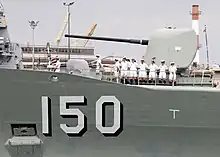 Anzac was deployed to the Persian Gulf for the third time from February until May 2003, as part of Operation Falconer.[23] On 21 March 2003, Anzac provided naval gunfire support during the Battle of Al Faw.[24] The intent of the assault was to capture the Al Faw Peninsula before Iraqi forces could sabotage the two major oil terminals in the area.[24] The frigate began her first fire support mission at 06:04 on 21 March (the first time a RAN ship had fired in anger in 31 years) and completed seven fire missions over a three-day period.[24] The frigate received the Meritorious Unit Citation on 27 November 2003 for her service during this deployment.[23] In March 2010, Anzac was awarded the battle honours "Persian Gulf 2001–03" and "Iraq 2003".[21][22]