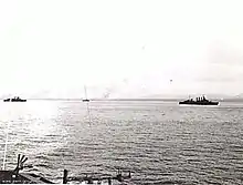Australia and Task Force 74 returned to Tanahmerah Bay on 16 May, to escort troopships to Wakde Island.[93] The task force left the troopships (which were also being escorted by Task Force 75) at 04:30 on 17 May, and commenced an hour-long shore bombardment of the area around Sawar and Sarmi just after 06:00.[93] The task forces provided fire support during the Battle of Wakde, then sailed to Humboldt Bay for replenishment.[94] On 25 May, the task force was temporarily redesignated Task Group 77.2, and sailed at 22:00 to provide escort, then fire support, for the amphibious landing at Biak.[95] At 06:30 on 27 May, Australia bombarded Biak Island.[96] Over the next few days, Australia and the ships under her command provided cover patrols and fire support for Allied forces ashore.[97] Predicting a heavy naval response from the Japanese, Crutchley was ordered on 1 June to return to Humboldt Bay with Australia and Task Force 74, then form a combined fleet with Task Force 75, which was to take up station northeast of Biak nightly from 4 June and intercept any Japanese forces encountered.[98] On the evening of 4 June, while en route, the fleet was attacked by Japanese dive-bombers; Australia was not damaged in the attack.[99] Crutchley's force was withdrawn on 6 June to replenish at Humboldt Bay, then returned the next day.[100] Aerial sightings of a Japanese force (three destroyers towing landing barges and three destroyers escorting, one of which was sunk by air attack) had been made during the day, and the Allied ships made radar contact at 23:19.[101] At 23:31, just after the Japanese ships fired torpedoes, Crutchley ordered the destroyers under his command to close and attack, while he brought Australia and the other cruisers into range.[102] The Japanese ships cast off their barges, turned, and fled, and Crutchley ordered the Allied destroyers to chase until 02:30 on 8 June, then retire; the cruisers broke off almost immediately as could not match the Japanese destroyers' speed.[103] The Japanese escaped with minimal damage.[104]