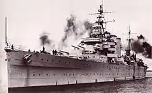 On 10 December 1934, Australia was sent to the United Kingdom on exchange duty, with the Duke of Gloucester, who had visited Victoria for the state's centenary of foundation the month previous, aboard.[11] The cruiser reached Portsmouth on 28 March 1935, and was assigned to the Mediterranean Fleet.[1] Australia returned to England from 21 June to 12 September to represent Australia at King George V's Silver Jubilee Naval Review at Spithead.[11][13] Following the outbreak of the Abyssinian crisis, Australia began to train for a potential war.[14] Australia's initial role in any British assault on the Italian Navy was to cover the withdrawal of the aircraft carrier HMS Glorious after an air attack on the base at Taranto.[14] The crisis eased before the need for British involvement occurred.[14] Australia remained in the Mediterranean until 14 July 1936, then visited Gallipoli in company with the new light cruiser HMAS Sydney, before the two ships sailed for Australia.[15] They arrived in Sydney on 11 August.[1][15] During the cruiser's time on exchange, the British cruiser HMS Sussex operated with the RAN.[1]