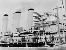 On 31 August 1954, Australia was paid off and marked for disposal.[141] She had been in service for 26 years, the longest career of a RAN warship to that date.[142] The ship was sold on 25 January 1955 to the British Iron & Steel Corporation for scrapping.[141] On 26 March, the cruiser was towed from Sydney Harbour by the Dutch-flagged tugboat Rode Zee.[141] The ships were later joined by two other tugs for the voyage to Barrow-in-Furness via the Suez Canal, where they arrived on 5 July.[135] Australia was broken up at Thos. W. Ward's Shipbreaking Yard at Barrow-in-Furness over the course of 1956.[11]