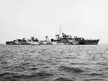 At the start of 1944, Warramunga helped cover the Landing at Saidor, before leaving Task Force 74 for refits in Sydney.[4] After rejoining the task fore at the start of February, Warramunga participated in amphibious landings in the Admiralties, at Tanamera Bay, Wakde-Sarmi, and Biak.[4] From May to July, the destroyer was assigned to patrol and escort duties.[4] On 22 July, Warramunga and the cruiser HMAS Australia sailed to Sydney for refits and leave.[4] Returning in August, the destroyer was involved in the Morotai landings on 15 September.[4] Warramunga was part of the covering force for the Leyte landings, and after Australia and USS Honolulu were damaged during the operation, escorted the two cruisers back to port for repairs.[4]