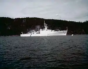 After commissioning, Skeena was assigned to the Second Canadian Escort Squadron based out of Esquimalt, British Columbia.[17][18] The Second Canadian Escort Squadron departed on a training cruise around the Pacific in January 1958, returning on 2 April.[18] On 29 January 1962, Skeena accidentally shelled an American village in the Strait of Juan de Fuca. As one of four ships practicing their gunnery, some of the shrapnel from the ship's guns fell on Clallam Bay, Washington. The commander of the warship, Richard H. Leir, faced a court-martial for the event.[19] He was later convicted.[20]