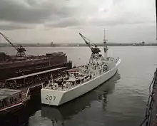 Skeena underwent conversion to a destroyer helicopter escort (DDH) beginning in 1964 by Davie Shipbuilding at Lauzon, Quebec. The vessel exited the yard and was recommissioned as a DDH with the hull number DDH 207 on 14 August 1965.[16] Following re-entry into service, the ship joined the Third Canadian Escort Squadron at Halifax, Nova Scotia.[18]