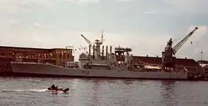 On 12 November 1975, Achilles collided with the Greek tanker Olympic Alliance in heavy fog in the Dover Strait, causing a number of injuries aboard Achilles together with heavy damage to the frigate's bow, while a large oil slick was released from the tanker into the Channel. Achilles was under repair at Devonport Dockyard until March 1976, with her complete bow section needing to be replaced.[14][15][16] The following year, Achilles joined the Fishery Protection Squadron during the Third Cod War with Iceland, spending one week on patrol.[14][17] During that year also, HMS Achilles was covertly deployed to Belize during the Guatemalan emergency.