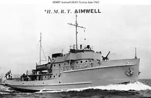 Aimwell was laid down on 15 November 1941 at the Defoe Shipbuilding Company in Bay City, Michigan, as BAT-7. She was delivered to the United States Navy and was transferred to the Royal Navy under the Lend-Lease Act on 6 June 1942. HMRT Aimwell was visited by Franklin D. Roosevelt on 26 January 1943, when Roosevelt was returning from the Casablanca Conference.[1] The tug was stationed with West Africa Command between 1942 and 1943.[2] She returned to American custody postwar on 30 March 1946. BAT-7 was struck on 1 May 1946 and sold to Moller on 6 January 1948. Renamed Patricia Moller, she was again renamed Golden Cape in 1952 and finally sold in 1971 to the Luzon Stevedoring Corporation.[3] She was renamed Hawkeye and was mined and sunk in the Mekong on 3 February 1975.[4]