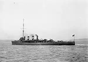 Ordered as part of the 1910 Naval Programme, Amphion was laid down at Pembroke Dockyard's No. 5 Slipway on 15 March 1911 and launched on 4 December by Mrs. Mundy, wife of the dockyard's Captain-Superintendent, Captain Geoffrey Mundy. She was completed in March 1913 and her first commander was Captain Frederic Dreyer with Lieutenant John Tovey as his First Lieutenant. Amphion was commissioned on 2 April and assigned to the 4th Battle Squadron of the First Fleet.[6] A month later, the ship was assigned to the 1st Light Cruiser Squadron by 18 May.[7] She remained with the squadron for nearly a year and was serving as the flotilla leader of the 3rd Destroyer Flotilla by 18 June 1914.[8]