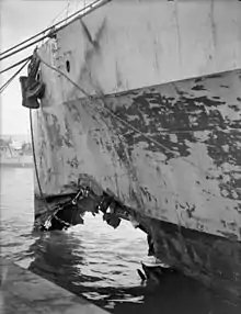 On 14 December 1942, Argonaut was heavily damaged when the Italian submarine Lazzaro Mocenigo struck the cruiser with two torpedoes from a spread of four,[4] causing serious damage. The bow and stern sections of the cruiser were effectively blown off and the steering wrecked. Though only three crew members were killed, the damage was so severe that German authorities mistakenly believed the Argonaut had been sunk.[1] The ship was patched up and limped to Algiers for more temporary repairs. It then sailed for the United States, where it underwent a seven-month reconstruction, completed in November 1943.