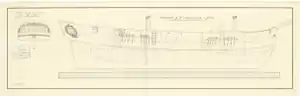 ![]() Drawing of Atalante showing the inboard profile with stern quarter decoration, and stern board outline with decoration detail, 1798 | |