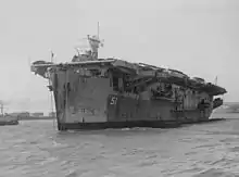 Aircraft facilities were a small combined bridge–flight control on the starboard side, two aircraft lifts 43 feet (13.1 m) by 34 feet (10.4 m), one aircraft catapult and nine arrestor wires.[3] Aircraft could be housed in the 260 feet (79.2 m) by 62 feet (18.9 m) hangar below the flight deck.[3] Armament comprised: two 4 in/50, 5 in/38 or 5 in/51 Dual Purpose guns in single mounts, sixteen 40 mm Bofors anti-aircraft guns in twin mounts and twenty 20 mm Oerlikon anti-aircraft cannons in single mounts.[3] They had a maximum aircraft capacity of twenty-four aircraft which could be a mixture of Grumman Martlet, Vought F4U Corsair or Hawker Sea Hurricane fighter aircraft and Fairey Swordfish or Grumman Avenger anti-submarine aircraft.[3]