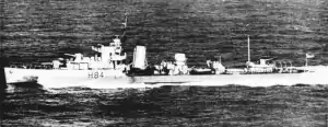 After working up, Brilliant was assigned to the 13th Destroyer Flotilla in Gibraltar in July 1943 and remained with them until September 1944 when she began a refit at Portsmouth. The ship was reassigned to the 1st Destroyer Flotilla in the English Channel in November. On 24 December 1944, Brilliant was escorting the troopship Leopoldville when Leopoldville was struck by a torpedo from U-486, 51⁄2 nautical miles off Cherbourg. Brilliant was able to rescue about 500 survivors from the damaged troopship, but due to various communication failures, no other vessels reached Leopoldville before she sank and 764 died.[21] Brilliant collided with the Canadian corvette Lindsay in dense fog[6] on 21 January 1945 off the Isle of Wight.[22] Brilliant's bow was badly damaged and she was transferred to Antwerp, Belgium, for permanent repairs after emergency repairs were made at Portsmouth. They were not completed until 23 April and the ship returned to Portsmouth for conversion to a submarine target and escort vessel. This was completed on 26 May and Brilliant escorted the light cruiser Jamaica with King George VI aboard as he visited the Channel Islands on 7 June. From 13 June, based at Holy Loch, Scotland, she escorted surrendered U-boats as part of Operation Deadlight before being paid off into reserve in November 1945. Her radar and communications equipment was removed before the ship was reduced to Category C reserve at Holy Loch on 29 April 1946. Brilliant was allocated to the Target Trials Committee on 11 September[6] and was used evaluate the shock effects of a 1,090-pound (490 kg) underwater explosion in April 1947.[23] The ship was turned over to the British Iron & Steel Corporation (BISCO) for scrapping on 21 February 1948. She was broken up beginning in April at Troon by the West of Scotland Shipbreaking Co.[6]