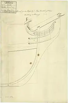 Bristol, named after the eponymous port, was ordered on 12 October 1768 to a design by John Williams. The ship, however, was not laid down until May 1771 at Sheerness Dockyard and was launched on 25 October 1775. Commissioned that same month, she cost £23,440 to build and a further £3,574 to outfit.[2]