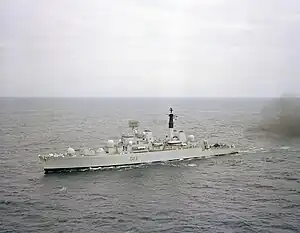 HMS Bristol (D23) was a Type 82 destroyer, the only vessel of her class to be built for the Royal Navy.[2][3] Bristol was intended to be the first of a class of large destroyers to escort the CVA-01 aircraft carriers projected to come into service in the early 1970s but the rest of the class and the CVA-01 carriers were cancelled as a result of the 1966 Defence White Paper which cut defence spending.