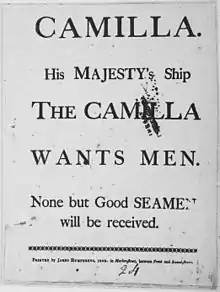 Camilla was commissioned in May 1776 and sailed for North America in August.[1] There she captured the privateer schooner Independence, John Gill, Master, of six carriage guns, eight swivels, and 50 men. She was on a cruise from Boston.[2][lower-alpha 1] Camilla also captured Admiral Montague, sailing from Hispaniola to Rhode Island with a cargo of molasses and coffee, Chance sailing to Georgia with coffee, and Polly, sailing to Surinam in ballast.[2]