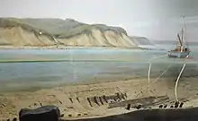 On 23 January 1781, while trying to intercept French ships attempting to run the blockade at Newport, Rhode Island, Culloden encountered severe weather and ran aground at North Neck Point (Will's Point) in Montauk.[4] All attempts to refloat the vessel were unsuccessful, but all the crew were saved, and Culloden's masts were taken aboard HMS Bedford.[5] The area is today known as Culloden Point.