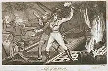 In 1805, while under the command of Captain Patrick Campbell, Doris was lost on a rock off Quiberon Bay.[16] She had arrived there on 11 January to bring news of a French squadron that was preparing to set sail, but when she arrived the British fleet was no longer in the bay. On the morning of the 12th, as Doris set sail, the weather worsened. Campbell returned to the bay to take shelter, at which time Doris hit the Diamond Rock in Benequet Passage. She took on water but the crew was able to get her nearly clear of water, in part by stretching a sail over the hole in her side and then pumping the accumulated water out. However, that afternoon the schooner Felix arrived with news that the Rochefort Squadron had sailed. Campbell felt it imperative that he get the news to the blockading squadron. As he set sail, it now being 15 January, the holes in the hull opened and despite her crew's efforts to save her she began to sink rapidly. Campbell anchored her eight miles north-east of Le Croisic and evacuated the crew to Felix and a passing American merchant schooner. He then set the ship on fire to prevent her use by the enemy.[16] He later took passage to Britain aboard HMS Tonnant.[17] The subsequent court martial reprimanded the pilot, Jean Le Gall, for his lack of skill.[16]