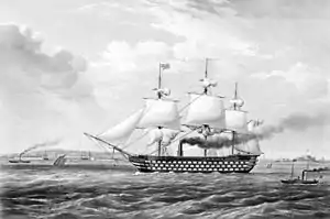 HMS Duke of Wellington was a 131-gun first-rate ship of the line of the Royal Navy. Launched in 1852, she was symptomatic of an era of rapid technological change in the navy, being powered both by sail and steam. An early steam-powered ship, she was still fitted with towering masts and trim square-set yards, and was the flagship of Sir Charles Napier.