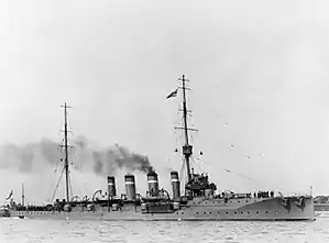 Glasgow, the sixth ship of her name to serve in the Royal Navy,[10] was laid down on 25 March 1909 by Fairfield Shipbuilding and Engineering Company in their Govan shipyard. She was launched on 30 September[11] and completed on 19 September 1910,[12] under the command of Captain Marcus Hill.[13] The ship was initially assigned to the 2nd Battle Squadron of the Home Fleet, but was transferred to the 4th Cruiser Squadron on the south east coast of South America the following year.[11] Hill was relieved by Captain John Luce on 17 September 1912.[13] From March to August, Glasgow cruised the coasts of Argentina, Uruguay and Brazil, making many port visits.[14]
