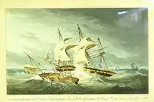 Four days later, Hermes and Belle Poule captured the American letter of marque schooner Gipsy (or Gipsey). She was on her way from New York City to Bordeaux with a cargo worth £50,000 when the British vessels captured her in the mid-Atlantic after a three-day chase.[9] Gipsey surrendered twice to Hermes and twice got away again before Belle Poule caught her. Gipsey was of 300 tons (bm) and was armed with twelve 18-pounder carronades and an 18-pounder gun on a pivot mount.