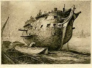 In 1865 she became an auxiliary to the training ship Britannia at Dartmouth, and remained part of that establishment until it was transferred ashore to the Royal Naval College there. She joined the boy artificers' training establishment at Portsmouth that year and was renamed Fisgard III. She was renamed Hindostan in 1920, and sold to J. B. Garnham & Sons in 1921.[2] After being broken up, her timbers and those of HMS Impregnable were used in 1924 in the renovation of the Liberty department store in London.[3]