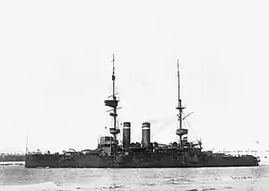 The keel for HMS Irresistible was laid down at Chatham Dockyard on 11 April 1898 and launched on 15 December 1898 in a very incomplete state to clear the building ways for the construction of the battleship Venerable. Irresistible was completed in October 1901.[3] The ship was commissioned at Chatham Dockyard on 4 February 1902 by Captain George Morris Henderson and a complement of 870 officers and men for Mediterranean Fleet service.[4] She left Portsmouth in late March 1902,[5] arriving the following month at Gibraltar where she relieved the turret ship Devastation as a guard ship. In May 1902 she visited Augusta, Sicily,[6] and in August 1902 she went to Piraeus.[7] In late December 1902 she was back in Greek waters when she visited Astakos in the Ionian Sea with HMS Bulwark and HMS Pioneer.[8]