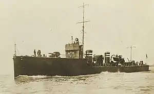 On the night of 22–23 April 1918, the Tátra-class destroyers Triglav, Uzsok, Dukla, Lika and Csepel under Fregattenkapitän Karl Herkner[9] carried out a raid to interrupt Allied shipping between Italy and Albania south of Valona (now Vlorë, Albania). Jackal, Hornet, Alarm, Comet, the Australian destroyer HMAS Torrens and the French destroyer Cimeterre were formed into three groups, with 10 mi (16 km) between each group. Jackal and Hornet encountered the Austro-Hungarian ships and turned towards, making the challenge signal. At a range of 1.5 nmi (1.7 mi; 2.8 km) the Austro-Hungarian destroyers opened fire, concentrating their fire on Hornet. Both British ships turned away, making smoke, with the intention of drawing the enemy south, but Hornet took a hit in the forward shell room and magazine, starting fires in both compartments and causing an explosion.[9] The bridge and tiller flat both received further hits, and the rudder jammed hard over to starboard, leaving the ship circling hard under fire. Jackal was turned to the east by her captain — Lieutenant-Commander A M Roberts — but after approximately 15 minutes of firing, Herkner in Triglav broke off the engagement, reasoning that the alarm had certainly been raised. Jackal continued the pursuit, but the faster Austro-Hungarians pulled ahead, and she lost sight of them by 00:20. Alarm, Torrens and Cimeterre had caught up with Jackal by 00:45, but by 01:35 the pursuit was called off.[9]