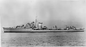 When repaired, Jackal was deployed in support of Allied forces in the Norwegian campaign, escorting troopships and carrying out shore bombardments, before being transferred to Harwich, as part of the Nore Command, carrying out convoy escort and patrol operations.[1] In July 1940, Jackal took part in the Dunkirk evacuation, patrolling to protect the evacuation ships.[6] Following Dunkirk, Jackal returned to the routine of convoy escort and patrols. On 11 October Jackal, together with the battleship HMS Revenge and the destroyers Javelin, Jaguar, Jupiter, Kelvin, Kipling and Kashmir, shelled Cherbourg harbour.[7] On 29 November 1940, Jackal, Javelin, Jupiter, Jersey and Kashmir were deployed to try to intercept a sortie by the German destroyers Karl Galster, Hans Lody and Richard Beitzen that resulted in Jackal's sister ship Javelin, commanded by Lord Louis Mountbatten, being torpedoed and badly damaged.[1][8]