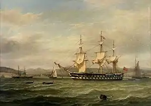 HMS La Hogue was a 74-gun third-rate ship of the line of the Royal Navy, launched on 3 October 1811 at Deptford.[1] She was named after the 1692 Battle of La Hogue. "The La Hogue of 1811 [...] sported a green and chocolate lion, its grinning mouth displaying rows of white teeth and a huge red tongue."[2]