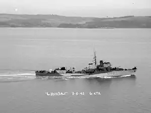 HMS Liddesdale was a Type II Hunt-class destroyer of the Royal Navy built by Vickers-Armstrong in Newcastle and launched on 19 August 1940. She was laid down on 20 November 1939 and commissioned 28 February 1941. She served as a convoy escort in the Mediterranean Sea.[1][2][3]