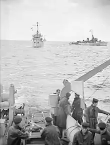![]() HMS Maenad showing pennant J435, and in dazzle camouflage | |