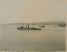 Monmouth, named for the Welsh county,[6] was laid down by London and Glasgow Shipbuilding at their shipyard in Govan on 29 August 1899,[1] and launched on 13 November 1901.[7] Her completion was delayed due to a collision with the liner Assyria in Glasgow harbour in late March 1902.[8] She arrived at Devonport in late August that year for trials, but was not finally completed and accepted until 2 December 1903,[1] when she was initially assigned to the 1st Cruiser Squadron of the Channel Fleet. She was briefly placed in reserve in Devonport at the end of January 1906, before being recommissioned in April for service on the China Station.[9] During 1913 Monmouth paid a courtesy visit to the German treaty port of Tsingtao on the Chinese Mainland.[10] Later in the same year she returned home and was assigned to the reserve Third Fleet.[11]
