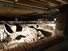 Some of Namur's timbers were used to support the floor of the wheelwright's workshop at Chatham Dockyard. They were rediscovered there in 1995 and identified in 2003.[9][10] The timbers represent approximately a quarter of the Namur 's frame and are from a contiguous section of the ship's orlop deck and adjacent hull frames. While deck beams were repurposed to form and support the floor of the wheelright's shop, many others were placed in the gaps between these beams and serve no structural purpose, including many of the ship's futtock and knee timbers. Evidence suggests that the timbers were removed sequentially from the Namur as the ship was dismantled and directly installed under the workshop. While repurposing of ship timbers for structural purposes ashore was very common, the rediscovered timbers of the Namur are rare in being entirely unmodified, still bearing original carpenter's marks, traces of red paint common to Royal Navy warship lower deck interiors of the period, numbers denoting sailor's hammock berths, hammock hooks and lengths of oakum. The presence of many superfluous lengths of timber in and under the new workshop floor and their unaltered condition has been suggested as a deliberate form of preservation by workers at the Dockyard at the time, in recognition of the fame of the Namur and its prestigious service record. It is possible that the preservation and hiding of as much fabric as possible from the Namur was officially sanctioned by the Captain Superintendent of Chatham Dockyard, James Alexander Gordon, who had served on the ship during the Battle of Cape St. Vincent in 1797.[11] The restored timbers form the centerpiece of the "Command of the Oceans" gallery at the Chatham Historic Dockyard museum opened in 2016.[12]