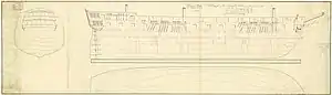 Newcastle was a spar-deck frigate, designed to carry thirty 24-pounders on her main deck, and twenty-four 42-pounder carronades on her spar deck (two fewer carronades than her half-sister), with four 24-pounders on her forecastle.[1] In 1815, after the War of 1812 and Napoleonic Wars, Newcastle and Leander were fitted with accommodation for a flag officer with a poop deck built over the quarterdeck, and were mostly used as flagships on foreign stations, replacing older 50-gun ships that had previously filled this role.[1][3] Both ships were re-rated as 60-gun fourth rates in February 1817.[1][4]