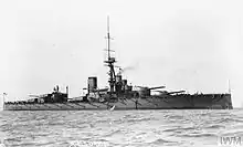 In 1914 the shelter-deck guns were enclosed in casemates. By October 1914, a pair of 3-inch (76 mm) anti-aircraft (AA) guns had been added.[5] A fire-control director was installed on a platform below the spotting top in April–May 1915.[6] Additional deck armour was added after the Battle of Jutland in May 1916. Around the same time, three 4-inch guns were removed from the aft superstructure and the ship was modified to operate kite balloons.[7] In mid-to-late 1917, Orion was the only battleship in the Royal Navy to receive a director for her secondary armament.[6] Two flying-off platforms were fitted aboard the ship during 1917–1918; these were mounted on 'B' and 'Q' turret roofs and extended onto the gun barrels. A high-angle rangefinder was fitted in the forward superstructure by 1921.[8]