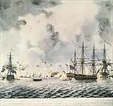 Pearl was anchored off Bombay Hook, Delaware, on 21 July. At 15:00, a fleet of twelve Continental Navy vessels, under the command of Charles Alexander in the frigate USS Delaware, came in sight. A signal gun was fired to warn her tender, which was ashore collecting supplies, then the ship weighed anchor and sailed off but ran aground on Cross Ledge. The tender was captured along with a fortnight's worth of provisions but Pearl managed to get free and escape downriver.[18] At 11:00 the following morning she spotted Camilla some 6 nautical miles (11 km; 6.9 mi) away. Pearl requested she join her and the two ships anchored to await the enemy fleet.[19] On the morning of 23 July, an American vessel came under a flag of truce but by this time the sixth-rate, HMS Liverpool, had sailed into view. At 06:00 the next day, the American fleet arrived and made a second attempt to discuss terms but were dismissed. The three British frigates cleared for action, the Americans scattered and were pursued up the river but not caught; the British losing sight of their quarry and giving up the chase the next day.[20]