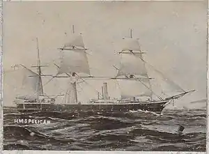 Pelican was commissioned into the Royal Navy on 29 November 1877.[1] In March 1878, Pelican was hailed by the French merchant ship Gustave, which had the crew of the American merchant steamship P. R. Hazeltine, which had foundered off Cape Horn, Chile on 18 February, on board. The captain of the American ship desired Pelican to take his crew on board, claiming the French ship was short of water, but later contradicting himself. As both ships would reach Valparaíso at about the same time, The captain of Pelican refused to take them on board. The French captain subsequently laid a charge that Pelican had refused to aid a ship in distress. This was refuted by two of the crew of P. R. Hazeltine in a sworn affidavit.[3]