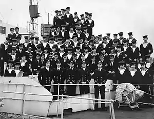 Petunia was transferred to Freetown, Sierra Leone in April 1942.[6] On 5 October 1942, Petunia was on passage to Freetown, when the corvette was spotted by the Italian submarine Barbarigo, which fired a spread of five torpedoes at Petunia. A lookout aboard the corvette spotted the wakes of the torpedoes, allowing Petunia to avoid them. Petunia then dropped a depth charge to discourage further attack, the noise of which causing Barbarogo's captain, Enzo Grossi, to claim to have sunk his target, which he identified as a Mississippi-class battleship.[8] On 11 October, Petunia rescued 126 survivors from the merchant ships Glendene and Agapenor, and took them to safety in Freetown. (Glendane had been sunk by U-125 on 8 October, with survivors picked up by Agapenor on 10 October, and then Agapenor was sunk by U-87 on 11 October).[9][10][11] Later that month, Petunia commanded the escort for Convoy SL 125, with four corvettes tasked with protecting 42 merchant ships. The convoy came under heavy attack by German submarines from 25 October. While at first the escort managed to drive the attacks off, from the night of 27 October, the U-boats began to breach the defences, and by the time that increased air cover caused the attacks to be called off on 1 November, twelve merchant ships had been sunk.[12][13] Throughout 1943, Petunia remained based in Freetown,[6] being recorded as part of the 40th Escort Group in August that year.[14] On 2 November 1943,[15] Convoy SL 139 left Freetown, joining up with Convoy MKS 30 off Gibraltar on 14 November, with Petunia forming part of the escort for this very large (66 merchant ships) combined convoy.[16] The Germans deployed large numbers of submarines against the convoy, in three patrol lines, but the heavy escort beat the attacks off, with three U-boats (U-211, U-536 and U-538) sunk, with one merchant ship sunk and one damaged by German air attack, and one sloop (Chanticleer) damaged by a German torpedo and later deemed not worth repairing.[16][17] In December 1943, Petunia returned to the United Kingdom.[6]