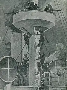 The barbettes were protected by 10-inch (254 mm) armour plates. The gun turrets that protected the main armament were six inches thick on their face, with three-inch sides and a 1-inch (25 mm) roof. They were initially built without a rear plate because of weight distribution problems with the turrets. The upper deck casemates were protected by 4-inch (102 mm) plates on the front and sides, but the main deck casemates had six-inch faces and sides. The stern torpedo tube was protected by a mantlet three to six inches thick. The sides of the forward conning tower were 9 inches (229 mm) thick while those of the rear conning tower were only three inches in thickness.[11]