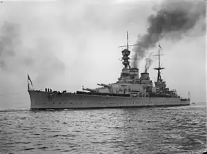 The ship's 15-inch gun turrets were modified to the Mark I (N) standard with their elevation increased to 30°. Twenty dual-purpose QF 4.5-inch Mark III guns in twin BD Mark II mountings replaced all of the 4-inch guns. Six of the gun turrets, three on each side, were abreast the forward funnel while the remaining four were mounted abreast the main mast.[23] The BD Mark II mounts had elevation limits of −5° to +80°. The Mark III gun fired a 55-pound (25 kg) high explosive shell at a new gun muzzle velocity of 2,457 ft/s (749 m/s).[28] Its rate of fire was 12 rounds per minute. They had a maximum effective ceiling of 41,000 ft (12,000 m).[29] The guns were controlled by four dual-purpose Mark IV directors, two mounted on the rear of the bridge structure and the remaining two on the aft superstructure. They fed tracking data to a HACS Mark IV analog computer for high-angle targets and an Admiralty Fire Control Clock Mark VII for low-angle targets.[23] Each gun was provided with 400 rounds of ammunition.[30] Three octuple Mark VI 2-pounder mounts were fitted, two on a platform between the funnels and the third at the rear of the aft superstructure. Each was provided with a Mark III* director. Four quadruple Vickers .50-calibre Mark III mounts were also added, two each on the forward and rear superstructures. The submerged torpedo tubes were removed and eight above-water torpedo tubes added.[23] This reconstruction, at £3,088,008, was more than three times as expensive as her earlier reconstruction.[20]