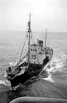 On 21 November 1940, Rhododendron, part of the escort for Convoy OB244, attacked the German U-boat U-103 with depth charges, helping to drive the submarine away from the convoy. Although U-103 escaped unscathed, this attack led to the incorrect claim that Rhododendron had sunk U-104.[5][2] That same day, she picked up 36 survivors from the merchant ship Daydawn, which earlier that day had been sunk by U-103.[2] At the beginning of 1941, Rhododendron was part of the 8th Escort Group.[6] On 17 January 1941, she detonated a mine in Liverpool harbor, knocking out her engines and steering gear and causing minor structural damage. Rhododendron was under repair at Liverpool for three months.[7][8][2] On 28 July 1941, she picked up 26 survivors from the Lapland, a merchant ship which was torpedoed by U-203.[2][9] On 1 October 1941, Rhododendron was part of the 36th Escort Group, based at Liverpool.[10]