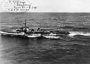 In November 1925, Sardonyx took part in search operations to find the missing submarine M1.[14] M1 had been sunk with all hands in a collision on 12 November, but the submarine's wreck was not found until 1967.[15] On 6 August 1931, Sardonyx was recommissioned at Portsmouth.[16] On 27 January 1932, Sardonyx and sister ship Sabre took part in the search for the missing submarine M2.[17] M2 had sunk the day before.[18] On 17 September 1935, as severe gales struck British waters, the steamer Brompton Manor sent out a distress signal while off the Owers lightvessel, near Selsey Bill. Sardonyx was ordered from Portsmouth to search for the steamer, which was successfully found later that day. Brompton Manor's captain had been washed overboard by heavy seas, and the ship's cargo shifted, giving a 30 degree list. Sardonyx stood by Brompton Manor until a tug could tow the steamer into Southampton.[19][20] Sardonyx ran aground off Southsea on 31 January 1938, but was soon refloated, and sustained no damage.[21]