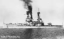 Temeraire was named after the French 74-gun ship of the line Téméraire that had been captured in 1759,[13] and was the fourth ship of her name to serve in the Royal Navy.[14] The ship was ordered on 30 October 1906[15] and was laid down at HM Dockyard, Devonport on 1 January 1907. She was launched on 24 August 1907 and completed in May 1909.[6] Including her armament, her cost is variously quoted at £1,744,287[2] or £1,751,144.[7] On 31 July 1909 Temeraire was taking part in a Royal Review of the Fleet at Spithead when an accident with a 4-inch gun injured three men, one of whom later died.[16] Temeraire was commissioned on 15 May 1909 and assigned to the 1st Division of the Home Fleet under the command of Captain Alexander Duff. She participated in combined fleet manoeuvres in June–July and was then reviewed by King Edward VII and Tsar Nicholas II of Russia during Cowes Week on 31 July.[17] Captain Arthur Christian relieved Duff on 25 October.[18] Temeraire was refitted in 1911 at Devonport and then took part in the Coronation Fleet Review for King George V at Spithead on 24 June 1911.[17] Christian was relieved in his turn by Captain Reginald Allenby on 12 August.[18] The 1st Division was renamed the 1st Battle Squadron (BS) on 1 May 1912. The ship was present in the Parliamentary Naval Review on 9 July at Spithead and then participated in manoeuvres in October. On 5 April 1913 Captain Cresswell Eyres assumed command of the ship.[18] The squadron visited Cherbourg, France in July.[17] Eyres was relieved by Captain Edwyn Alexander-Sinclair on 1 September.[18]