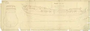 ![]() Drawing showing the body plan, stern board outline, sheer lines with inboard detail, and longitudinal half-breadth for Warwick | |