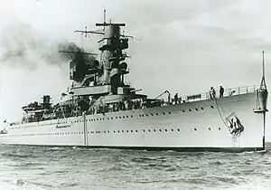 HNLMS De Ruyter (Dutch: Hr.Ms. De Ruyter) was a light cruiser of the Royal Netherlands Navy. She was originally designed as a 5,000 long tons (5,100 t) ship with a lighter armament due to financial problems and the pacifist movement. Later in the design stage, an extra gun turret was added and the armor was improved. She was the seventh ship of the Dutch Navy to be named after Admiral Michiel Adriaenszoon de Ruyter.